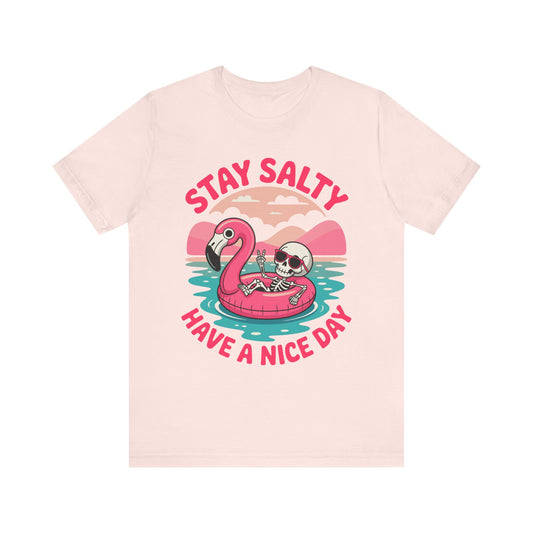 Beachy Skeleton Unisex Tee, Flamingo Float Graphic Shirt, Summer Vacation Top, Skeleton Beach Theme Apparel, Casual Skeleton T-Shirt